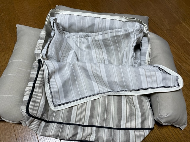 両サイドと奥のクッションがそれぞれすっぽり入るスペースがあり、ファスナーで閉じられる仕様。